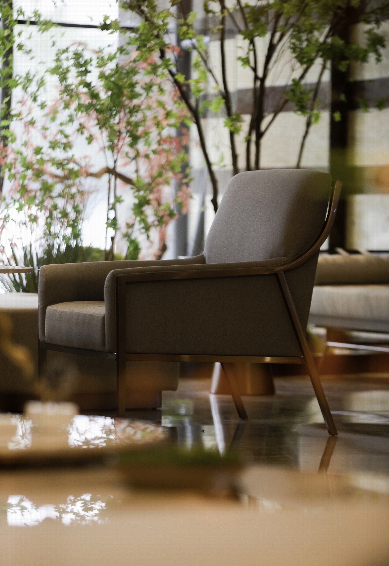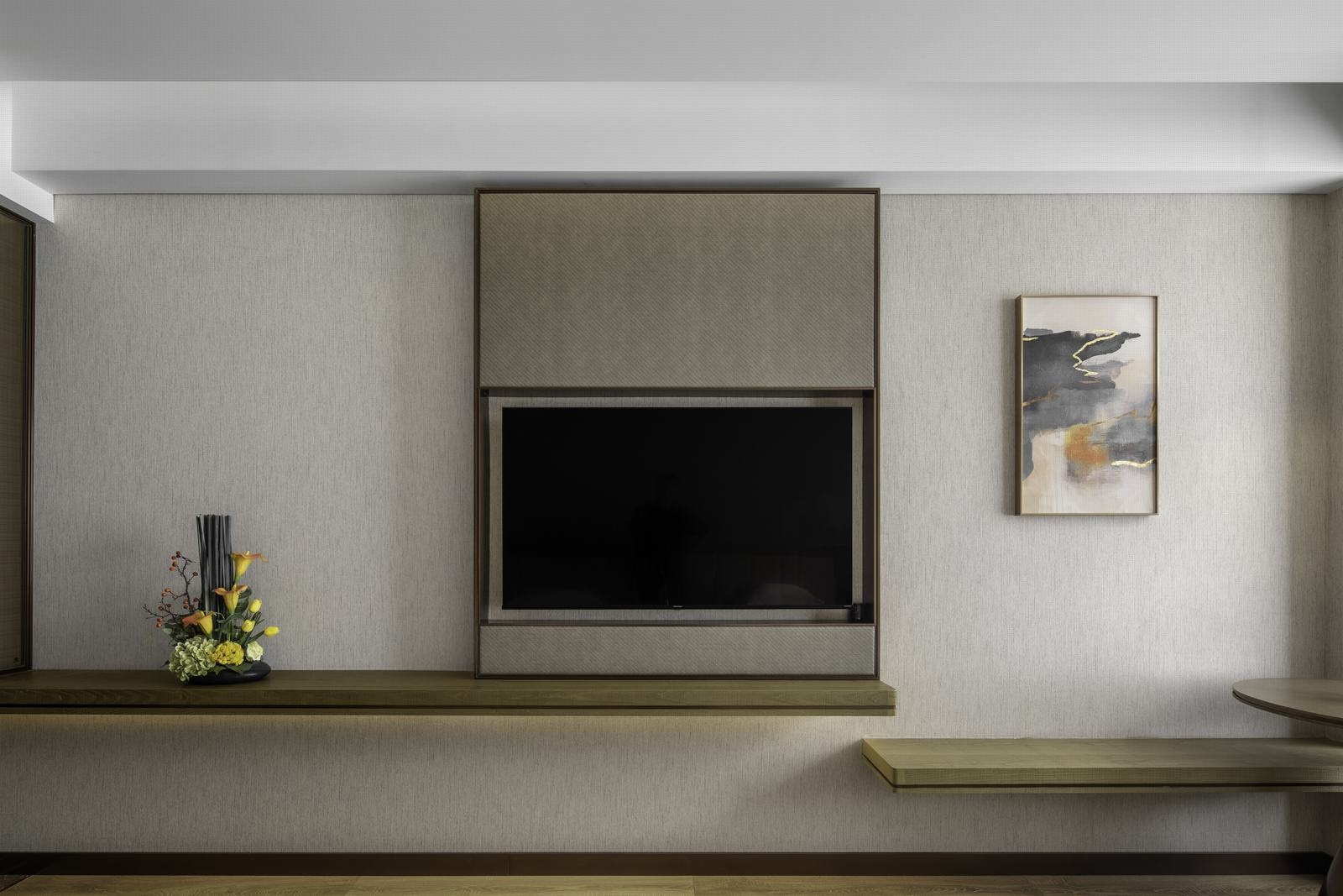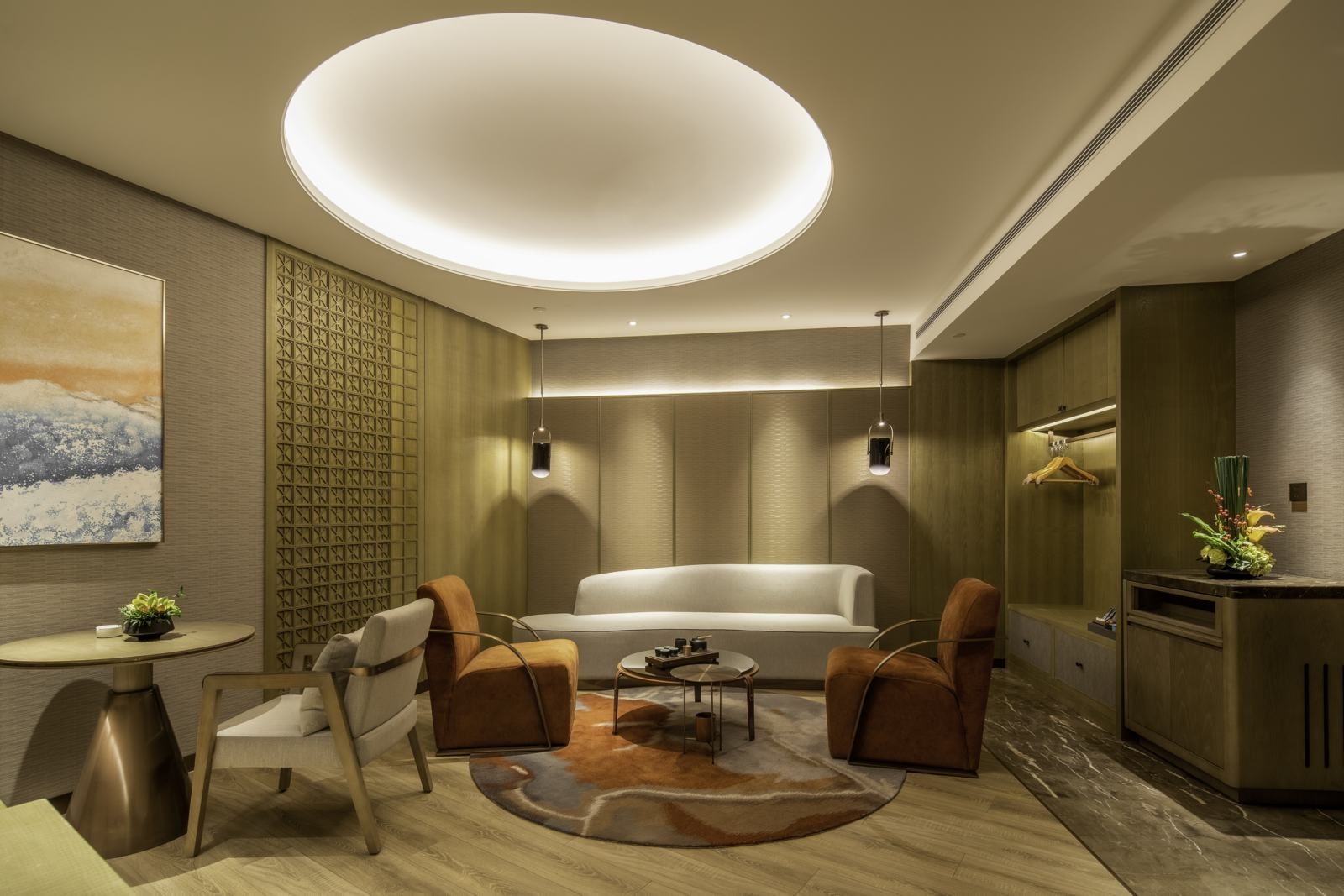 传统东方艺术中和了现代材料的硬朗,花艺与自然风光画作的巧妙点缀,让空间悄然活跃。乌海的山河沙石抽象浓缩为挂画或装置,艺术韵味如影随形,居于其中,感受温文儒雅的气质。