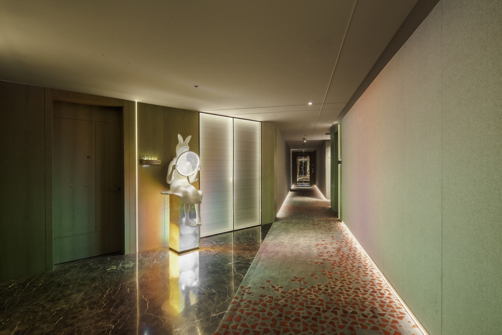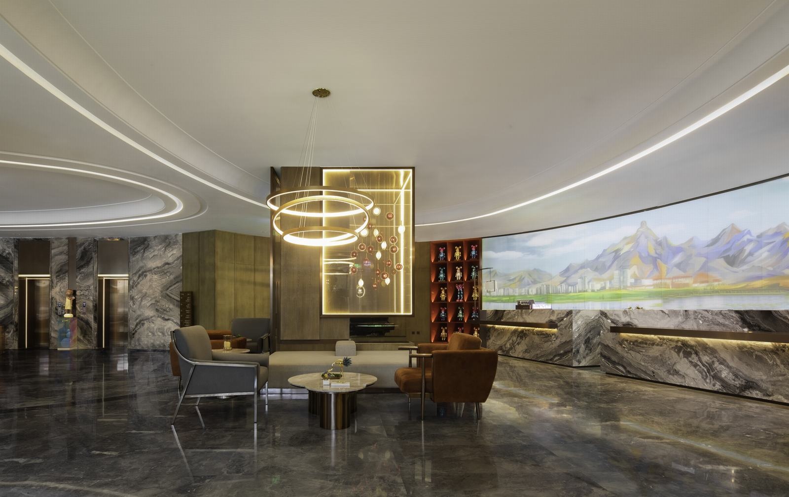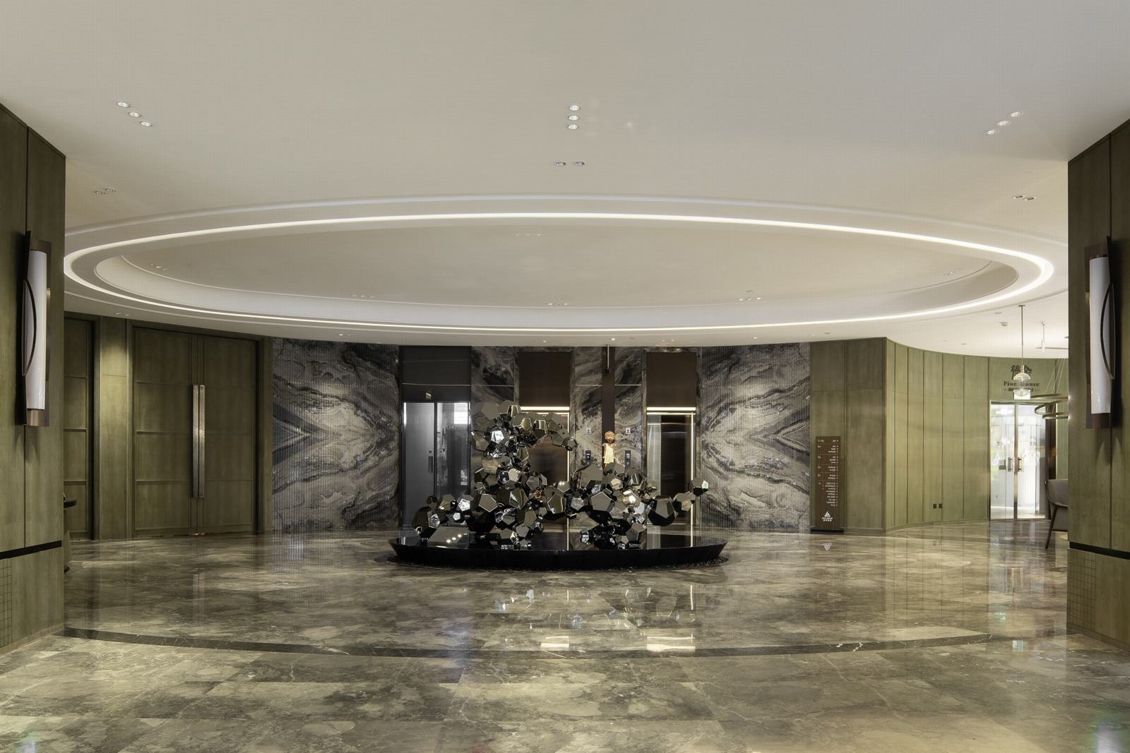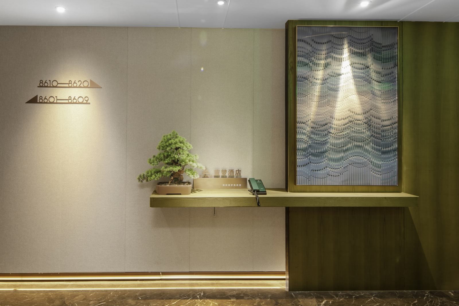 开放姿态的酒店一楼,将接待大厅、餐厅及宴会厅纳入同一空间,满足不同客群需求。艺术品与电梯厅墙面不同程度的融入,既增强了空间的灵动性,也呼应了蓝梦的创作理念。