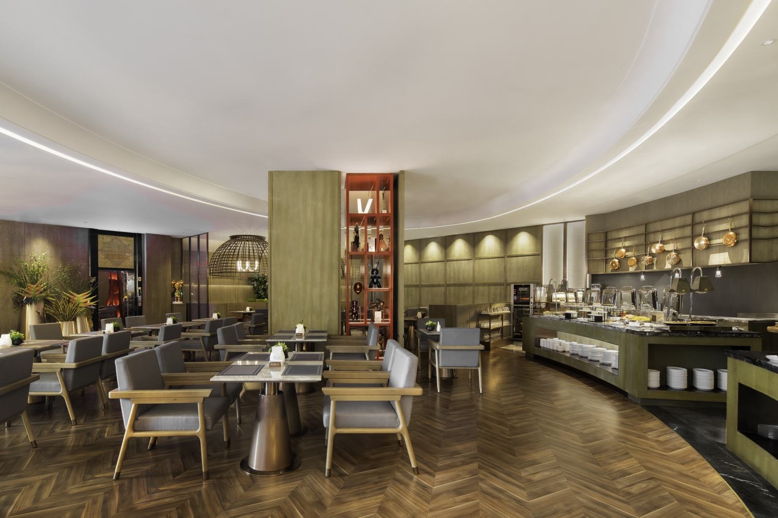 以木饰面作为餐厅的底色,结合艺术装置及潮流IP元素,以现代手法实现了转译,烘托出蓝梦酒店的现代感与艺术性。