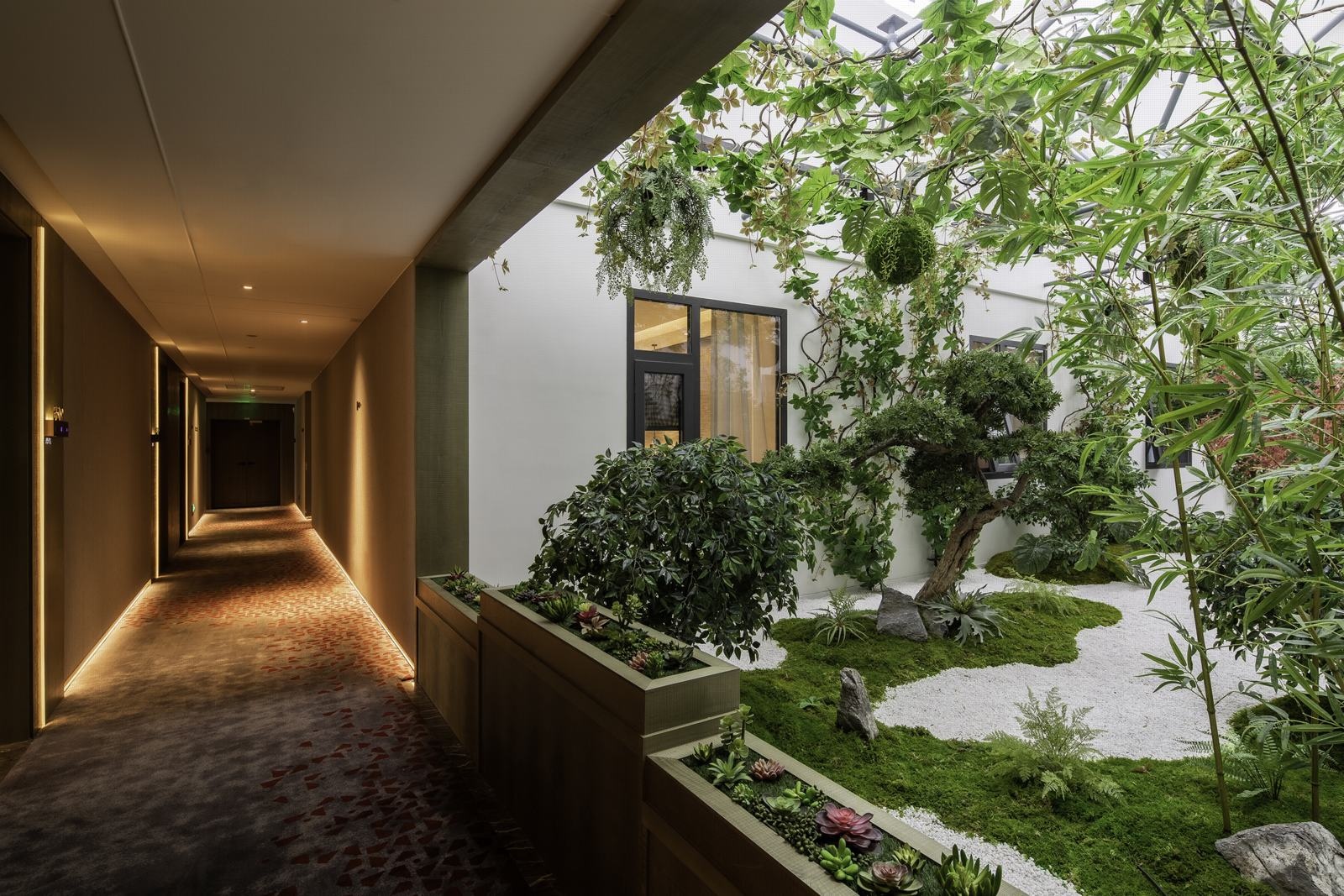 非设计纳入景观花园至客房公区,动人的框景和借景,打破了走廊的单调。以凝练手法让入住的客人享受更多天空与阳光,留下温柔的记忆。