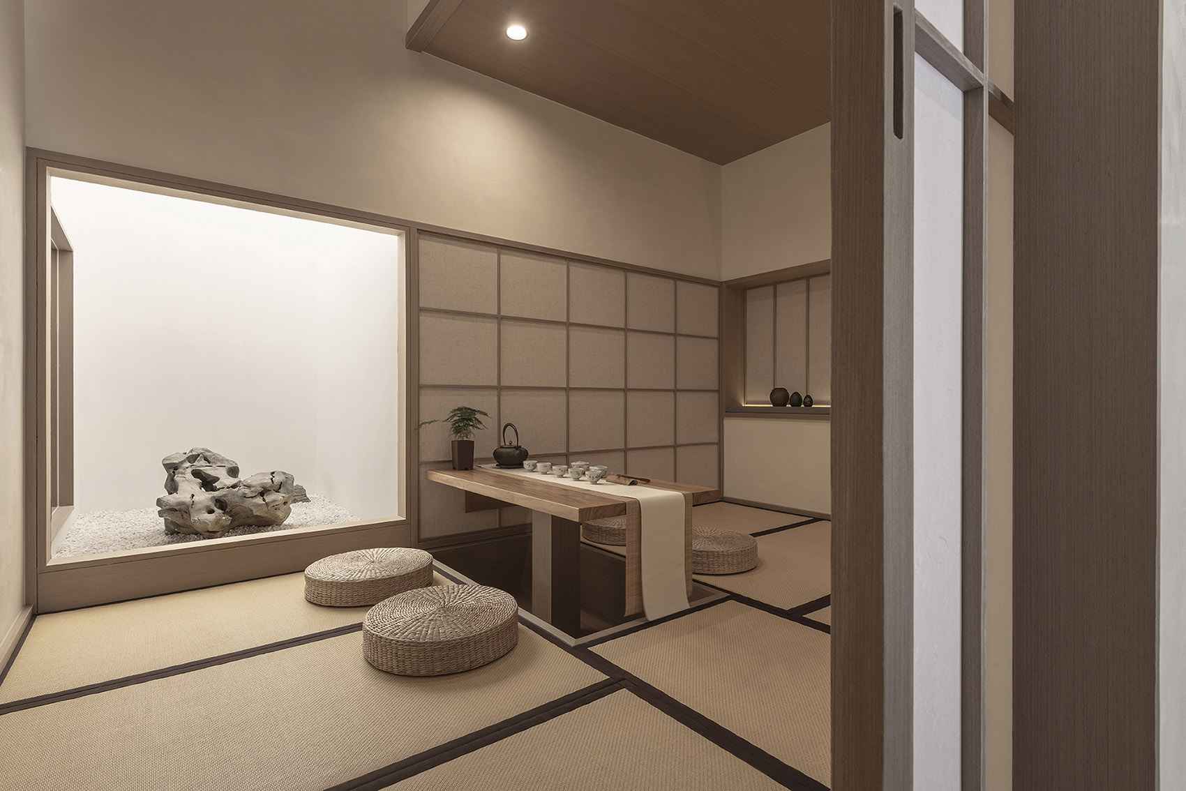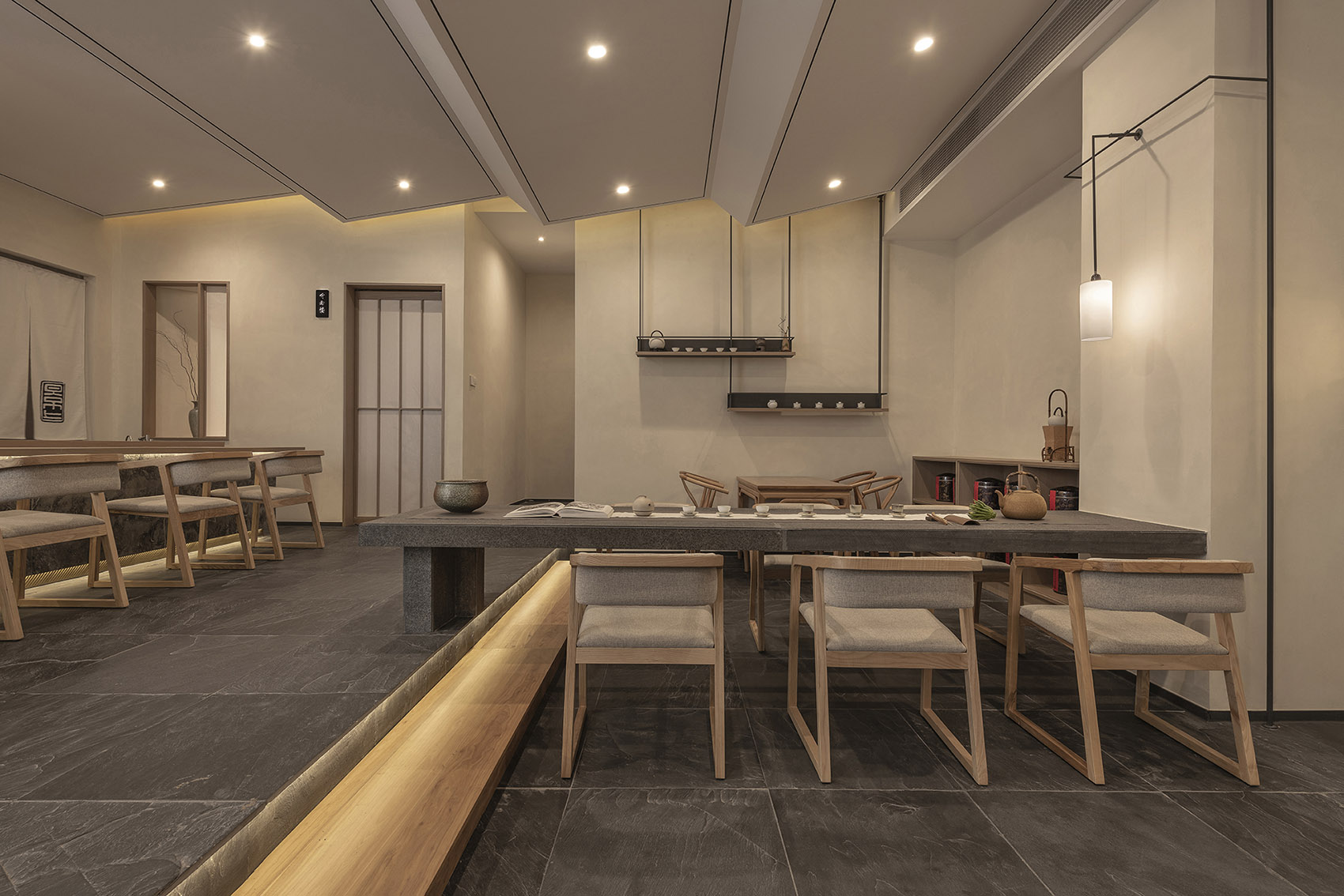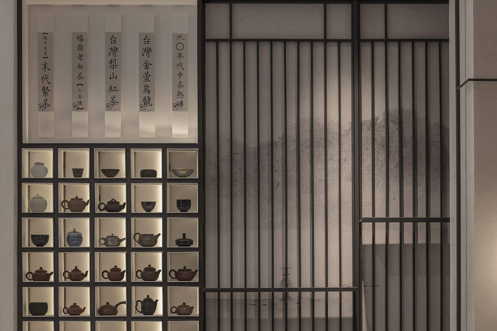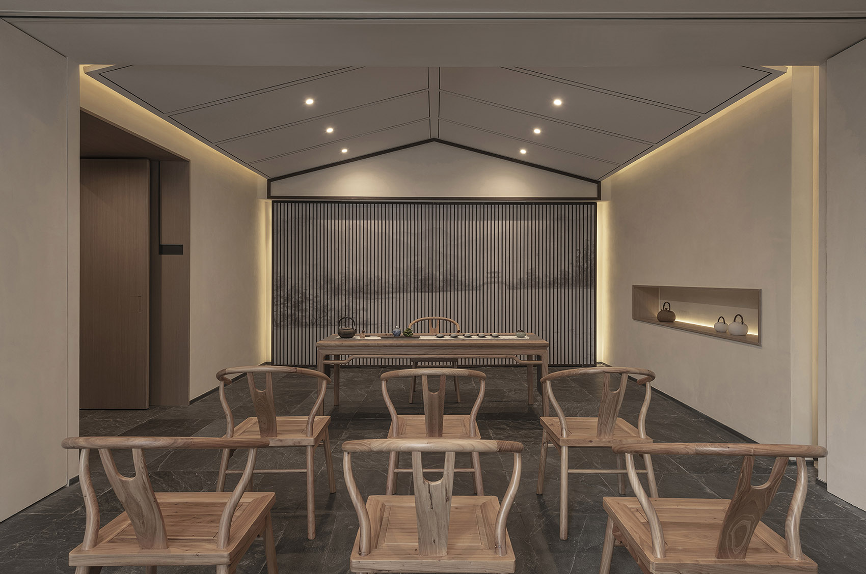 缘起于茶,而不止于茶,由于人们情感的融入,便给予茶之于茶本身之外的语言形象。茶空间即是对茶室主人心境最直观的表达。茶如此,空间亦然。设计师细心品读甲方诉求,意会出“书不尽言、言不尽意”的空间表达意向。在空间氛围设计的表述上,设计师以意造境,观者即境会心,营造立象以尽意的空间感。