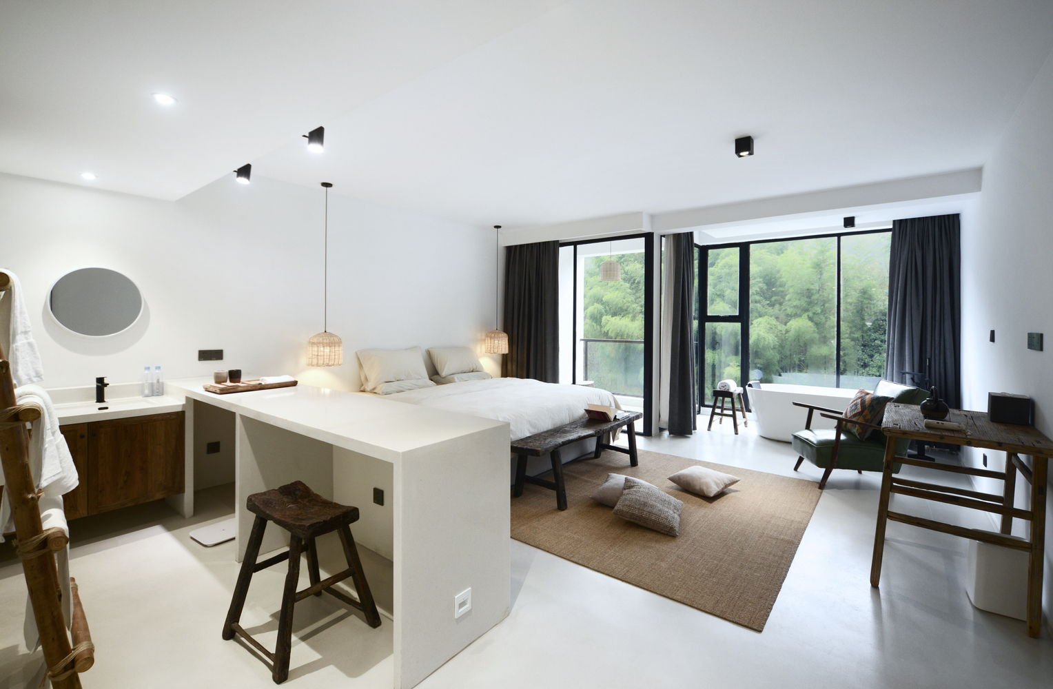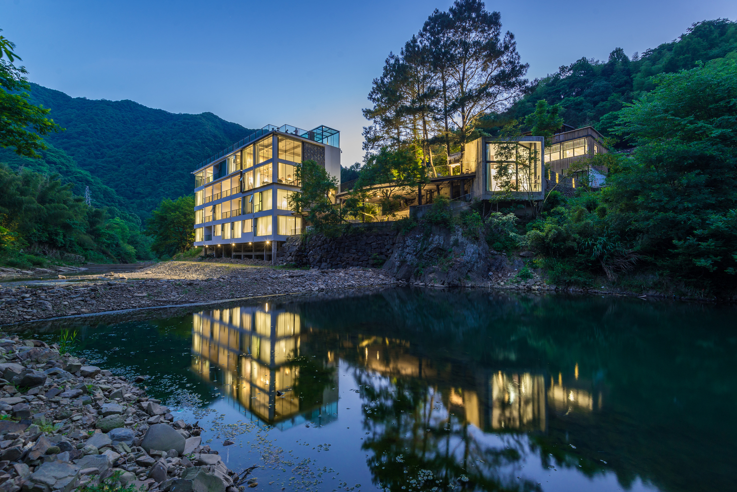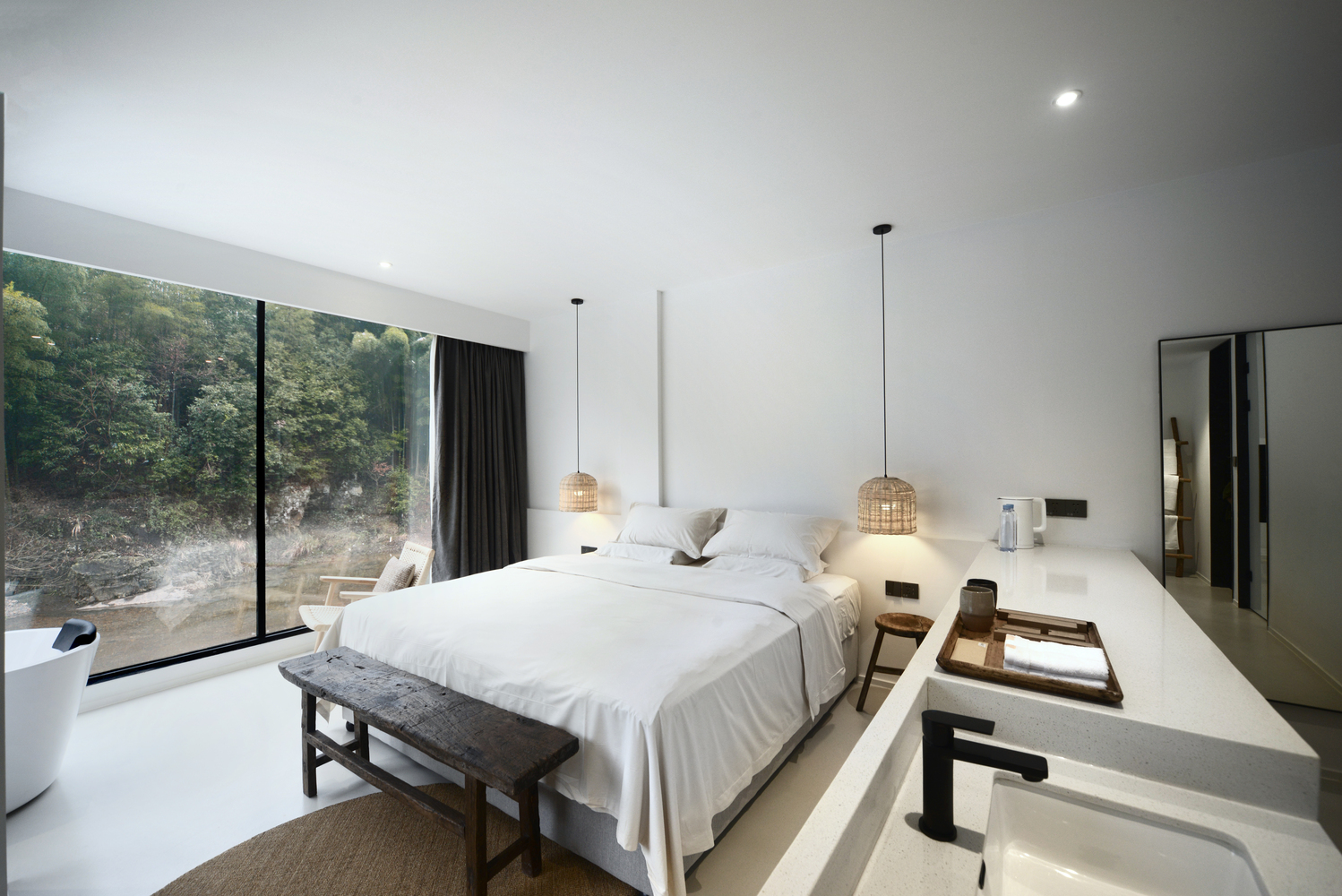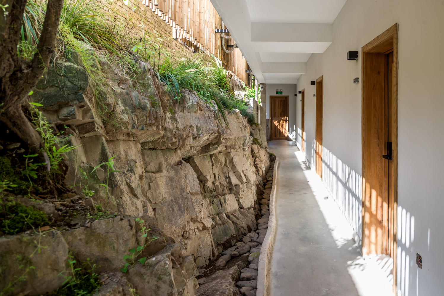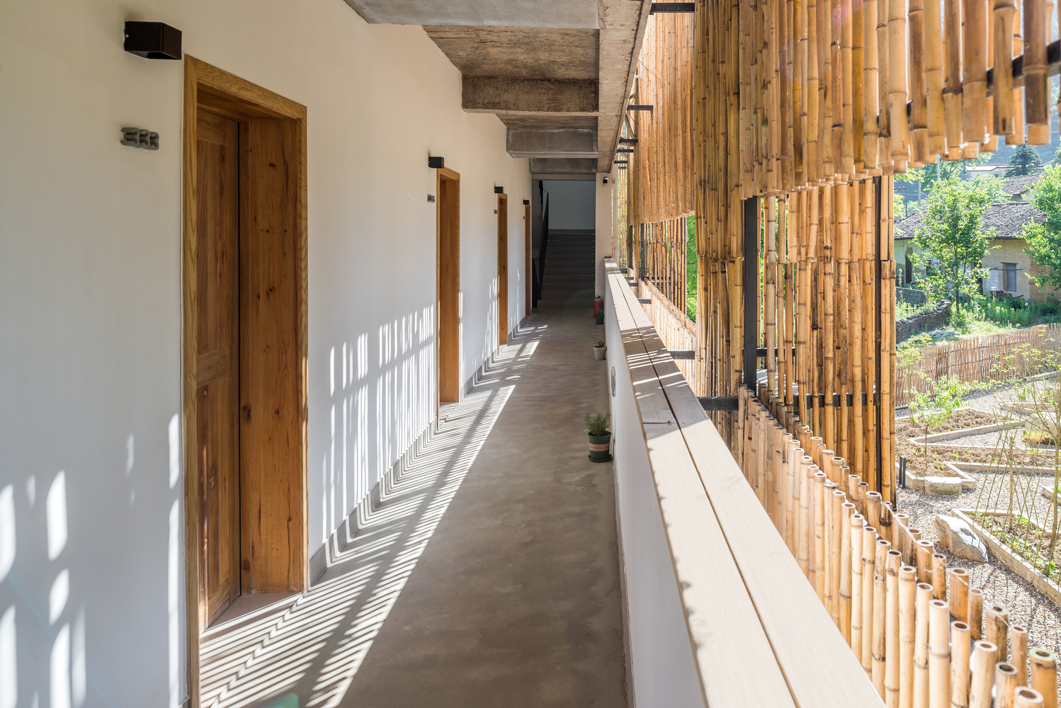 设计着重于当地竹子的运用,将它运用于建筑主立面,以当代的语汇重新诠释了该地区的传统竹制建筑形式,同时将建筑北立面融合于周围的竹林中。